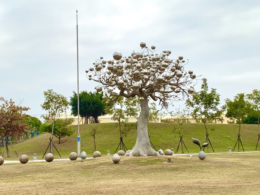 這棵感恩樹從樹幹到葉片、果實,整體都是由不鏽鋼所鍛造,樹梢上吊掛著大大小小的不鏽鋼球果實,光滑的金屬面映照著不同角度的天空,像極了外星來的魔幻樹,是對曾經為台灣這塊土地無私奉獻犧牲的人們,所表達的感恩之意。