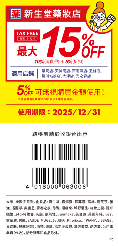 - 優惠券內容:免稅10%+5%折扣優惠 (最高可享15% off)