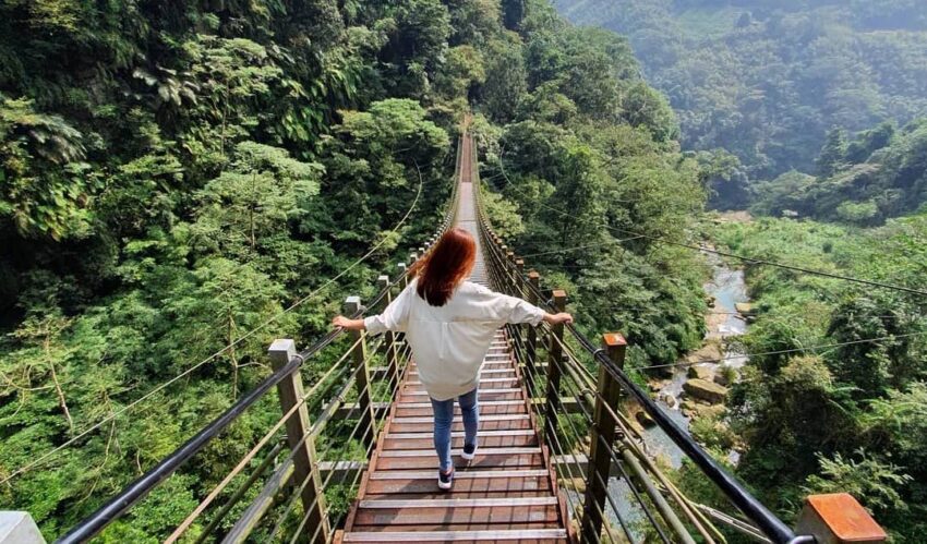 從青龍瀑布的岔路前行,就會抵達玉福吊橋,玉福吊橋是在921後重建的,橫跨太極峽谷的加走寮溪,站在吊橋上能欣賞到底部峽谷,深邃的峽谷斷層和清澈見底的碧藍溪水,頗有深山秘境的感覺,同時,玉福吊橋也是最能明顯看到太極峽谷S型線條的地方。