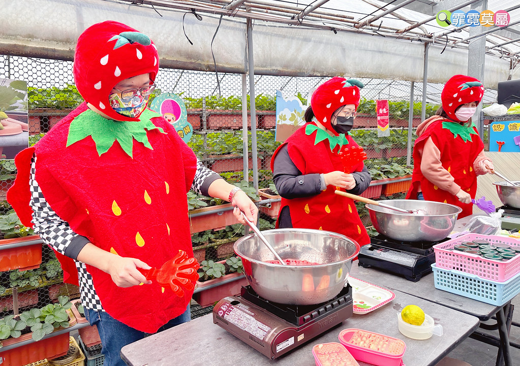 再把果醬放到前面去由大人們輪流上場煮,我們家爸爸再次裝扮成草莓人煮果醬,農場會請大家一起加油打氣,每次這環節大家都笑翻也覺得超好玩😆