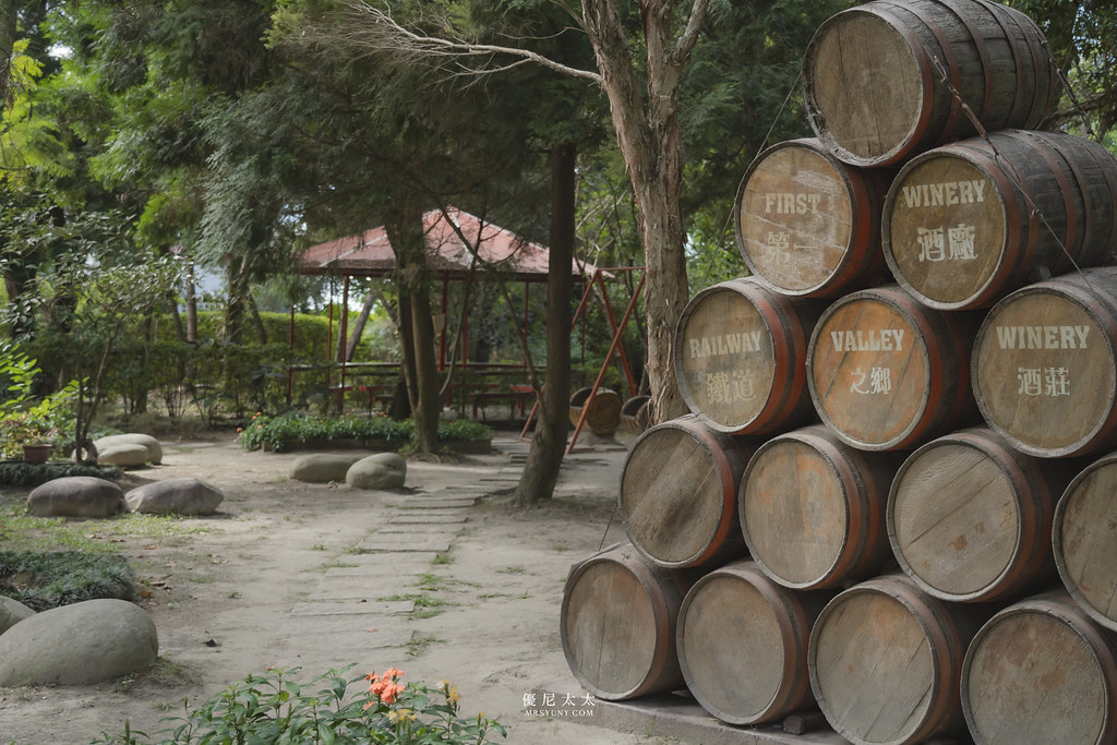 在即將進入花樑鋼橋前,有一處休憩站可以停留,沿著指標駛出主道路,充滿歐洲庭院風格的「鐵道之鄉酒莊」印入眼簾,小小庭院中有著趣味造景,如火車造型建築和酒桶堆砌成的金字塔,最吸引小朋友的目光莫過於那支巨大紅蘿蔔,每個角落都能成為拍照的好地方。另外,酒莊三樓有著免費的觀景台,可以俯瞰整條鐵馬道的美景,而園區內設有簡餐餐廳,可以享用午餐或下午茶,品嚐特色葡萄酒。