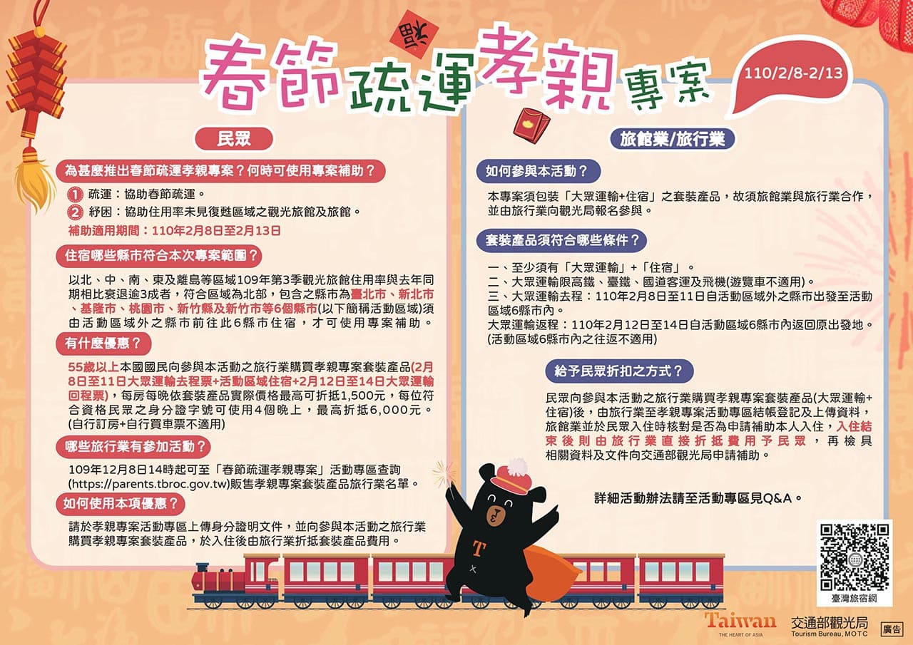 - 須透過旅行業者,購買春節孝親補助套裝(交通+住宿)