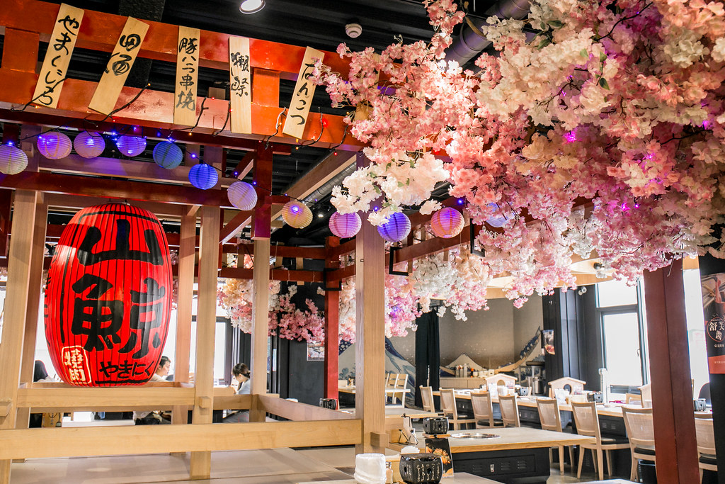 店內席次算蠻多的,有分成一般席及榻榻米座位區 (無包廂),空間寬敞坐起來蠻舒適的,此次前往剛好為『櫻花季』造景,座位區被櫻花點綴繽紛,再搭配餐廳正中間的大型日式燈籠,真的會有以為自己在日本的錯覺。