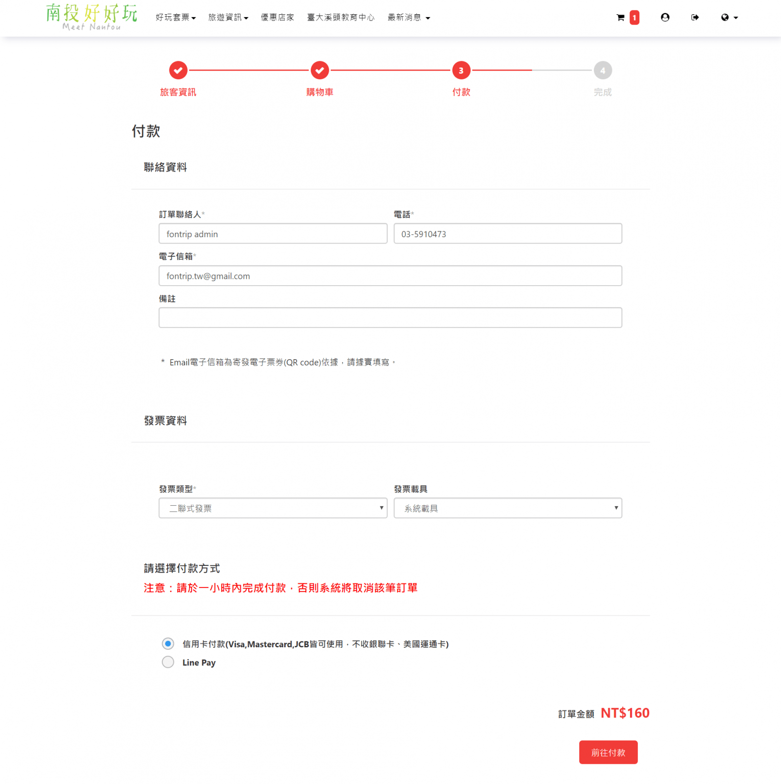 步驟5. 聯絡資料、選擇付款方式-填寫聯絡人、電話、電子信箱(*Email電子信箱為寄發電子票券QR code,請據實填寫。) -提供信用卡(Visa,Mastercard,JCB皆可使用,不收銀聯卡、美國運通卡) 及Line Pay(*請於一小時內完成付款,否則系統會自動取消此筆訂單)